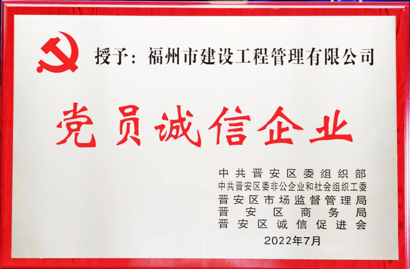 9月22日上午,晉安區(qū)委組織部等部門聯(lián)合舉辦晉安區(qū)第二批“黨員誠信示范店”“黨員誠信企業(yè)”授牌表彰會,我司榮獲“黨員誠信企業(yè)”榮譽稱號。這個稱號是對我司長期以來誠信經營的肯定,也是對我們今后堅持誠信合法經營的一種鞭策。